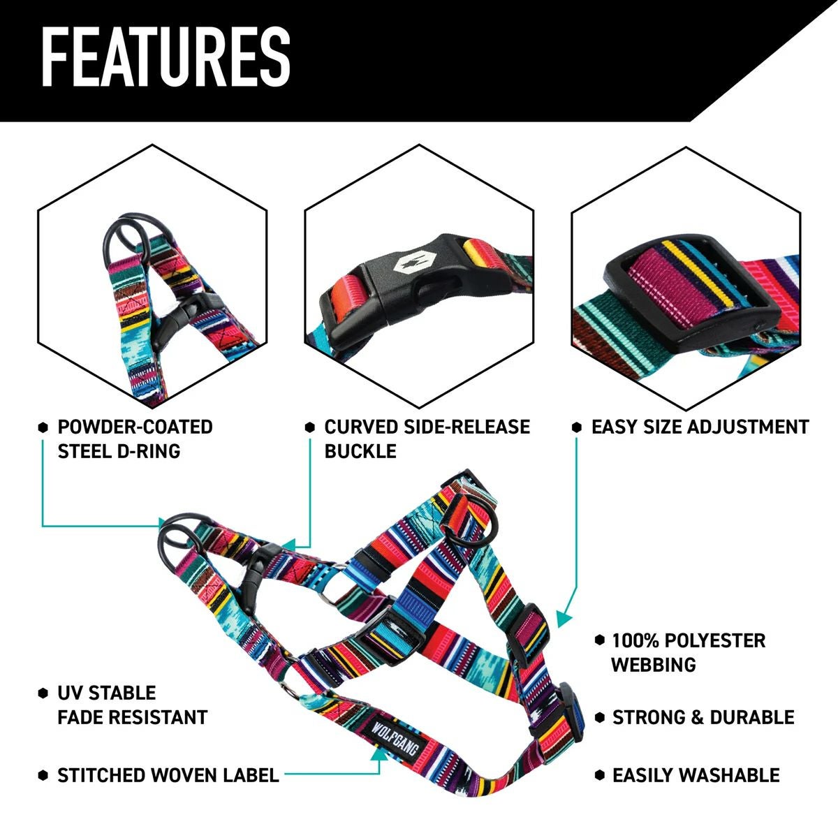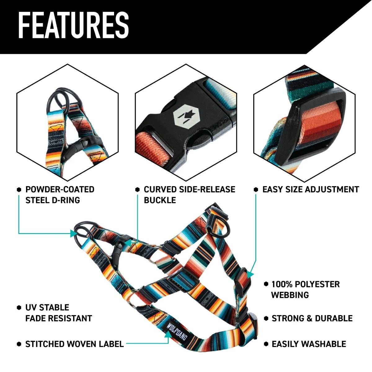 WOLFGANG のハーネスは、それぞれのストラップが調節可能で、快適な装着が可能な3ストラップハーネス。